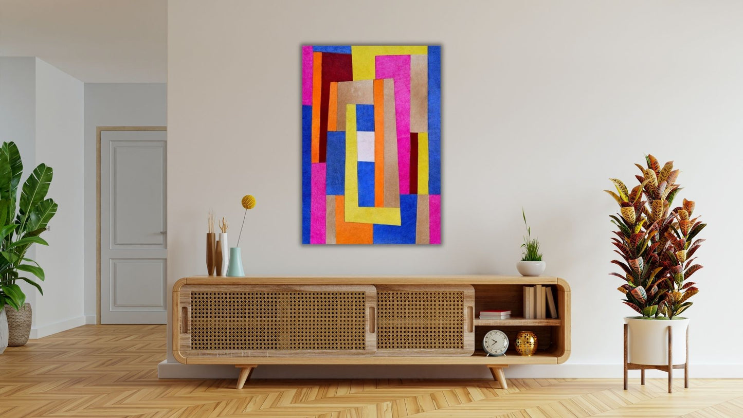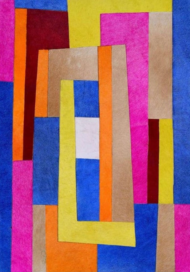 "Escapes" is a geometric marvel in handcrafted leather art, showcasing an intricate labyrinth of vibrant, interlocking rectangles. This handmade leather wall hanging is a visual escape into color and form, offering a striking handmade leather wall piece. It's the epitome of handicraft leather wall decor, making it an exquisitely bold leather wall hanging for a modern aesthetic.