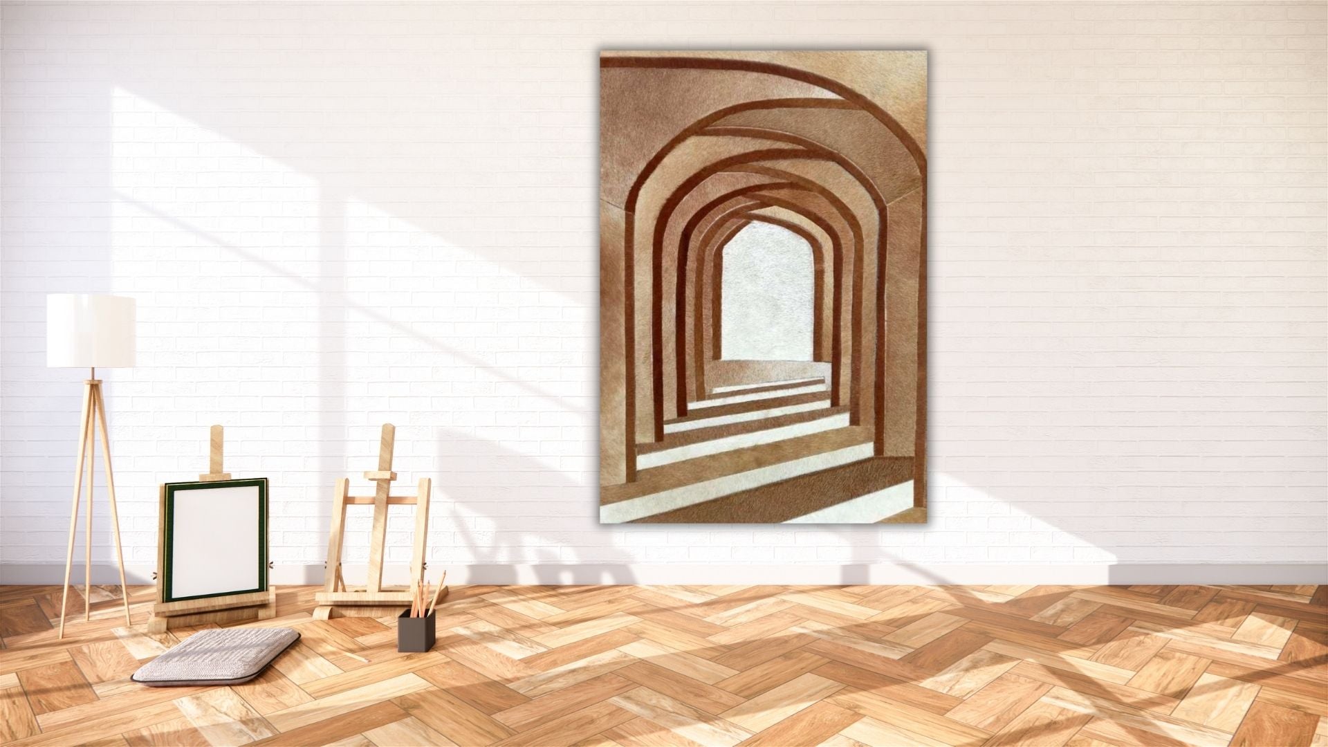 Discover the "Hall of Fame", an exquisite handcrafted leather art that embodies sophistication. This handmade leather wall hanging showcases an intricate series of arches, creating a mesmerizing perspective. As a handmade leather wall piece, it stands as a testament to skilled craftsmanship, enhancing any space with its elegant handicraft leather wall decor.