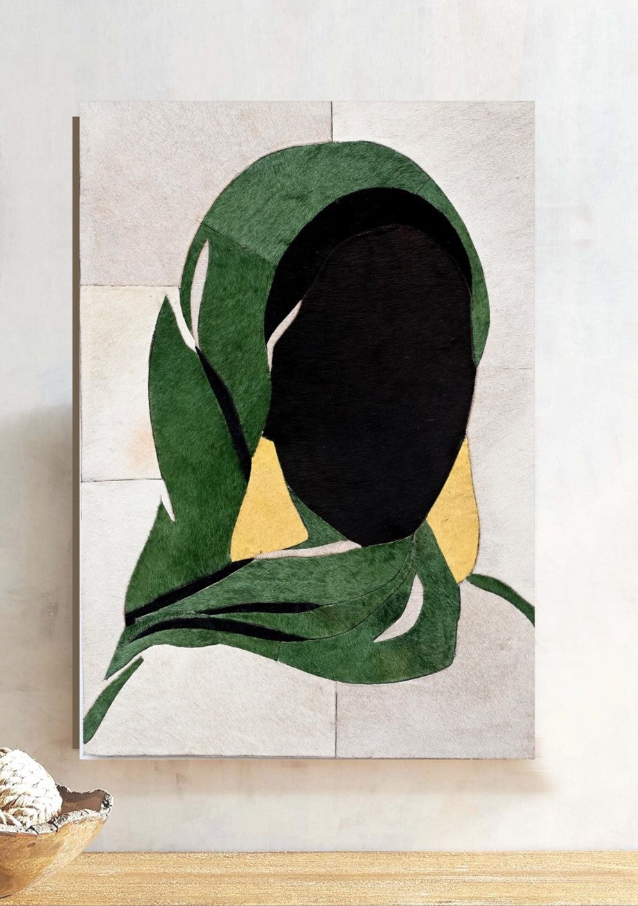 "Rhythmic Reflections" exudes tranquility with its handcrafted leather art, a handmade leather wall hanging that captures the serene essence of nature. The artful arrangement of greenery around a peaceful silhouette embodies a sophisticated handicraft leather wall decor. This unique handmade leather wall piece enriches any room, offering a serene leather wall hanging that resonates with the harmonious balance of the natural world.